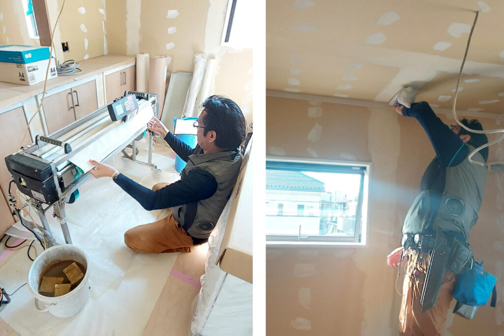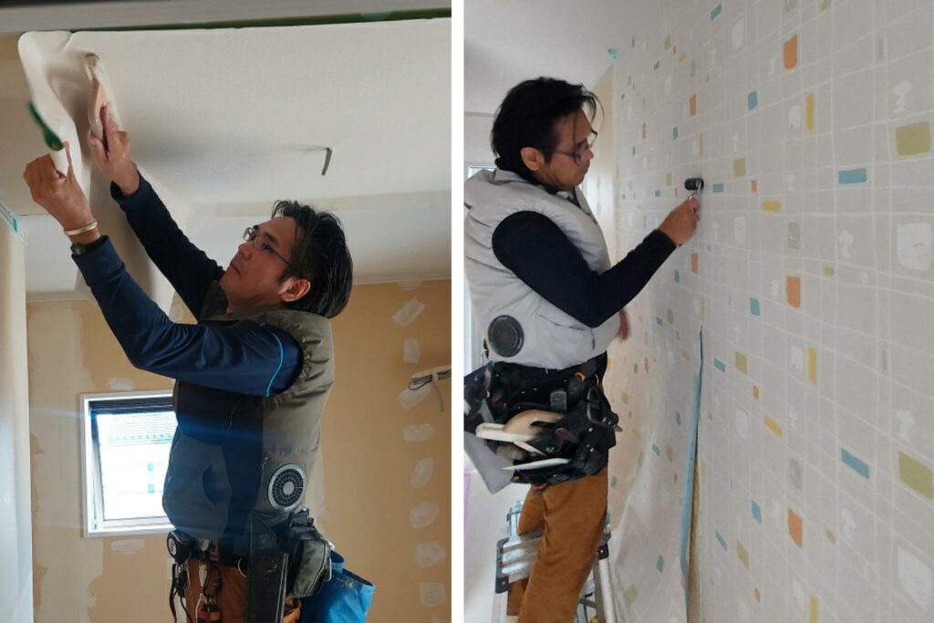 クロスがすべて貼られ、職人さんが現場の清掃をしてクロス工事が完了しました🙌