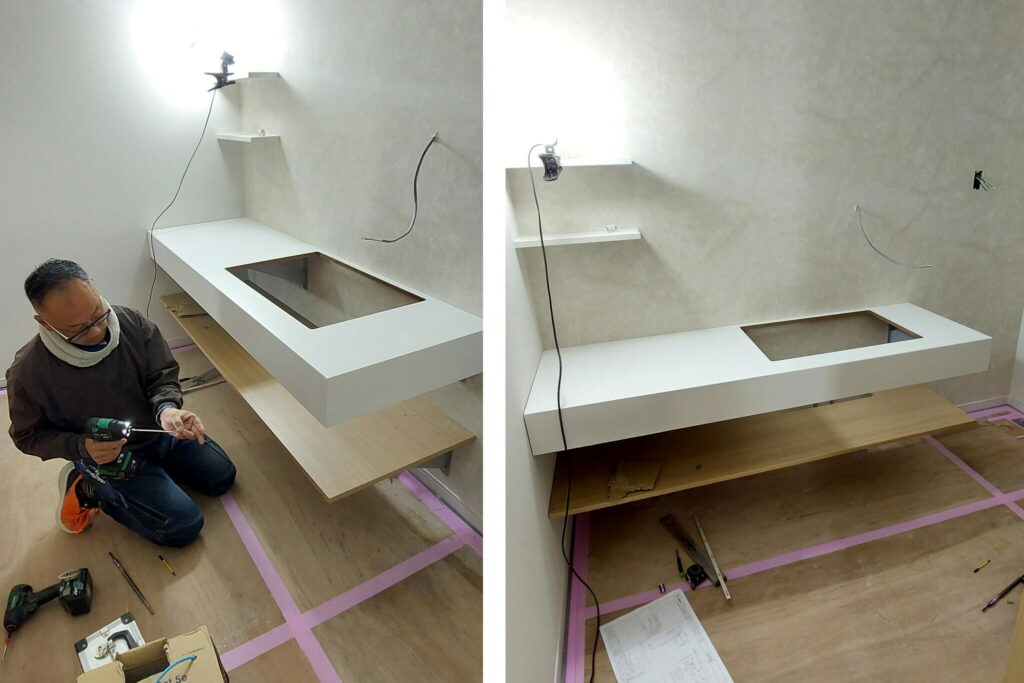 洗面所のクロスが完了したので大工さんが洗面台の取付を行いました