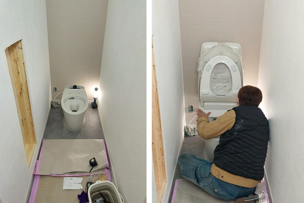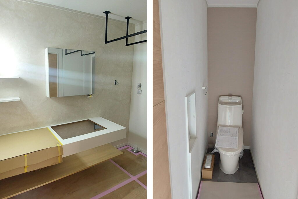 水道屋さんも化粧台や便器の設置、接続工事を行いました🏠