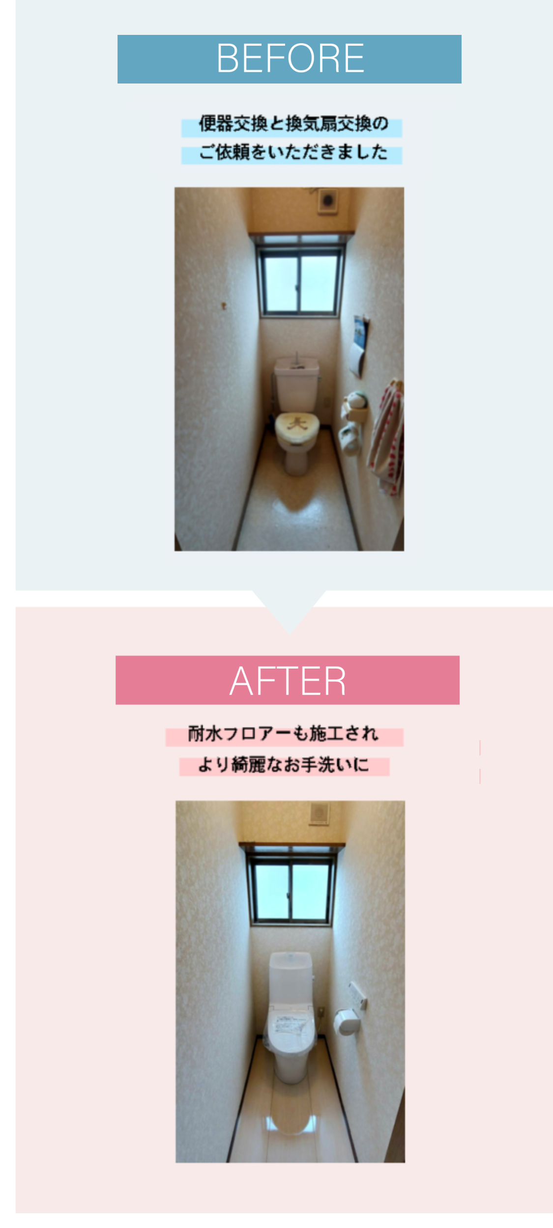 便器交換と床の重ね貼り、換気扇の交換を行いました。