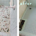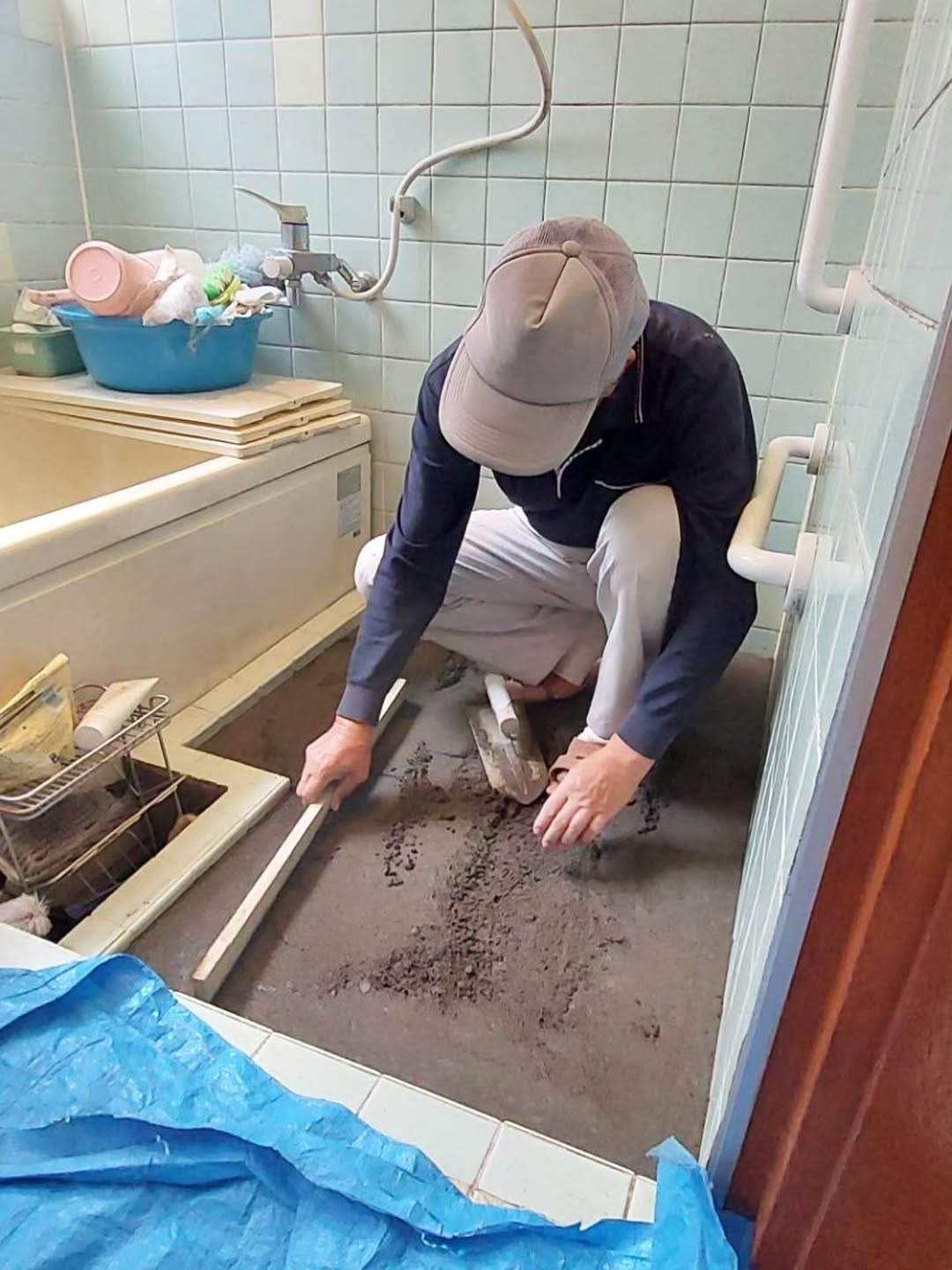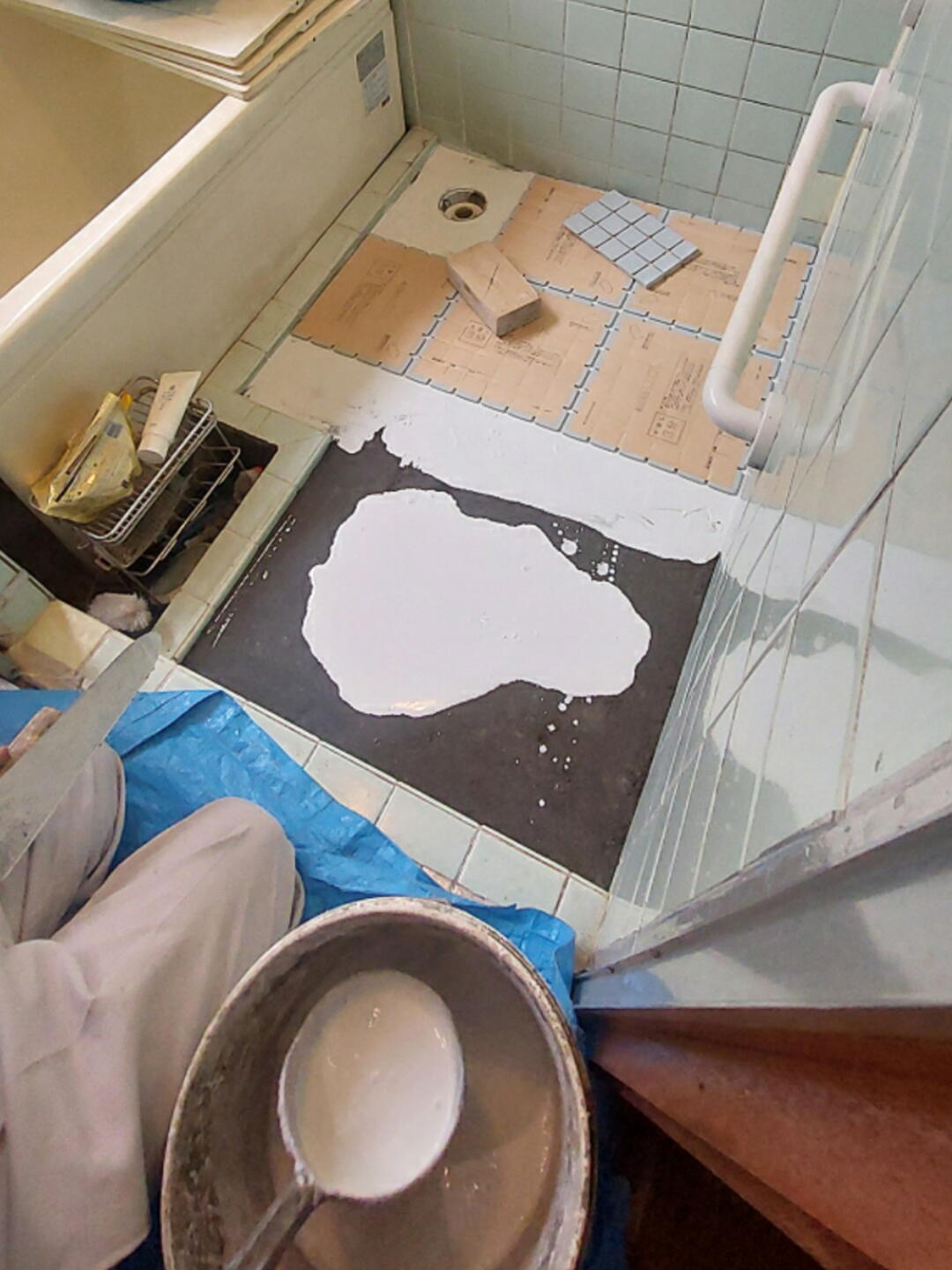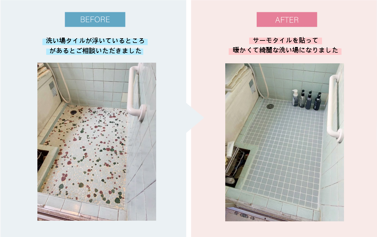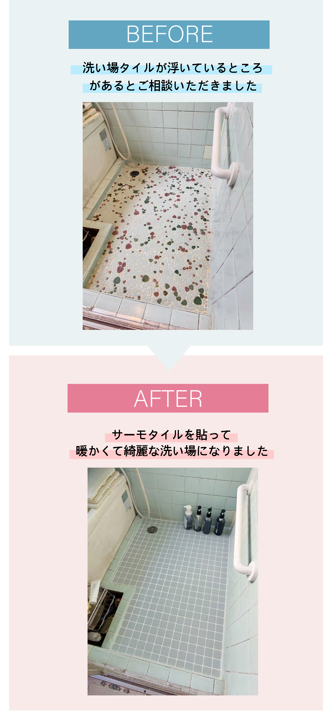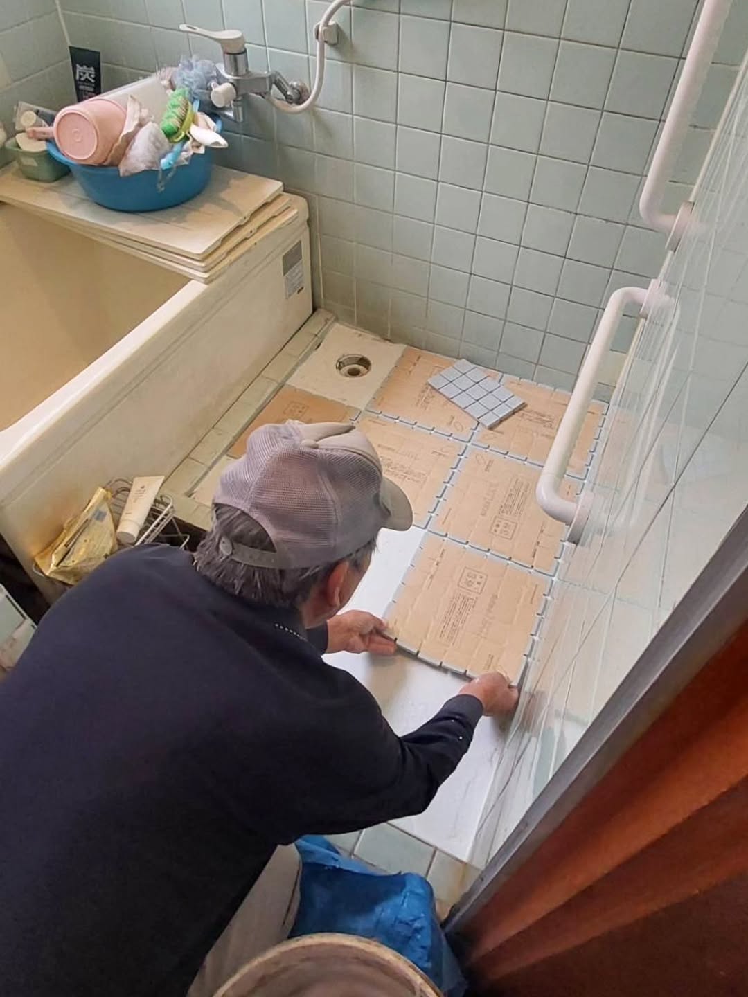 浮いているタイルを剥がしてから下地作業を行い、LIXILのサーモタイルを施工。