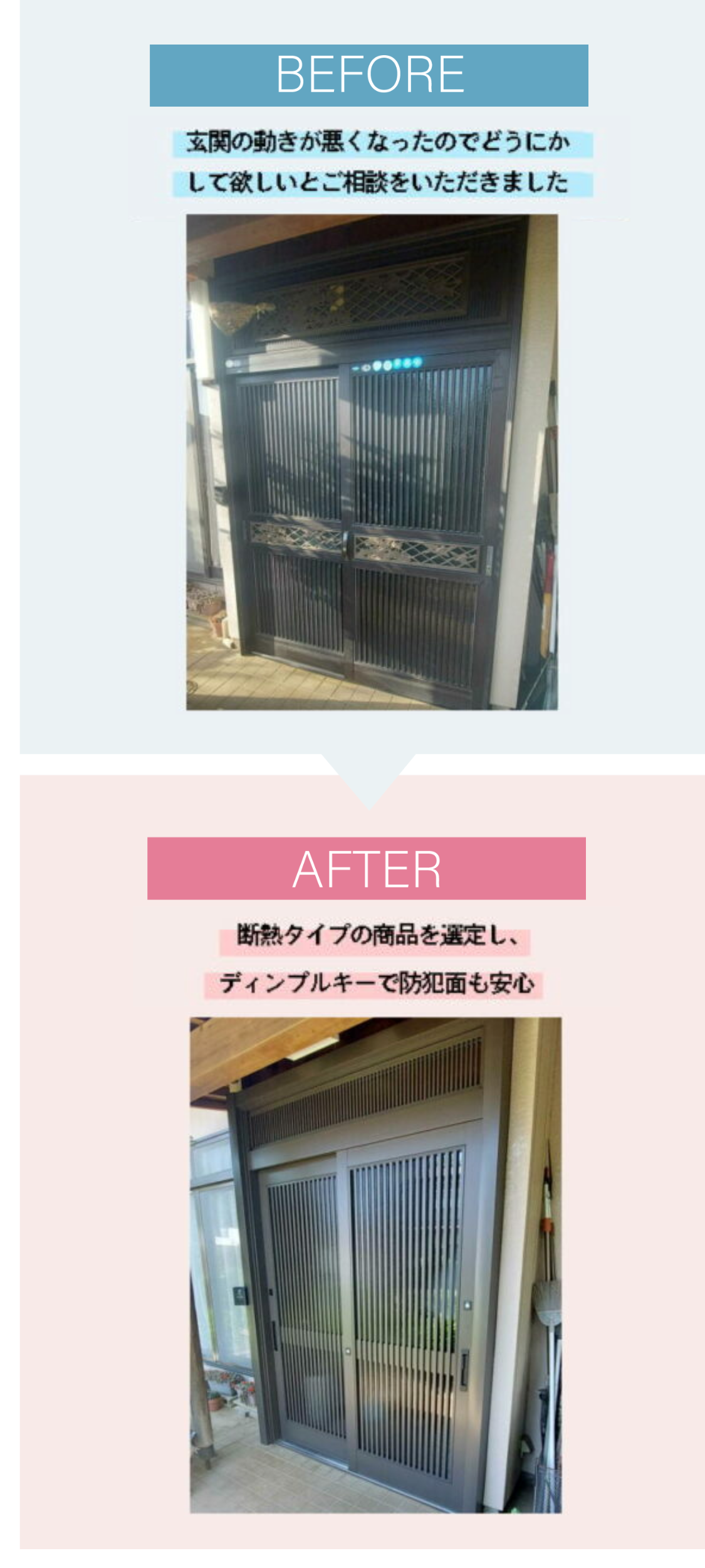 鍵もディンプルキーで防犯面も安心な玄関ドアになりました。