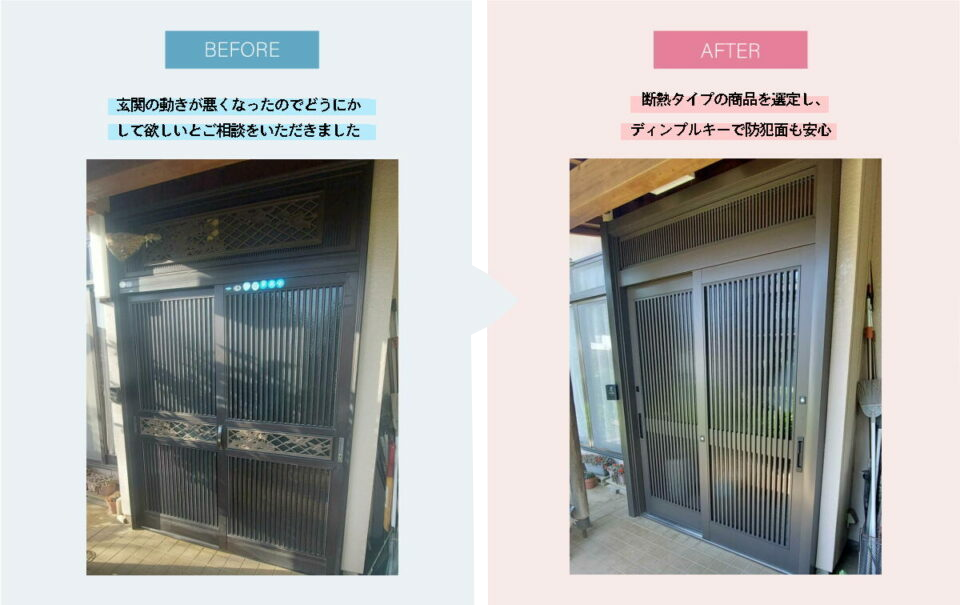 1DAYリフォーム商品のLIXIL リシェント玄関引戸2を採用。
