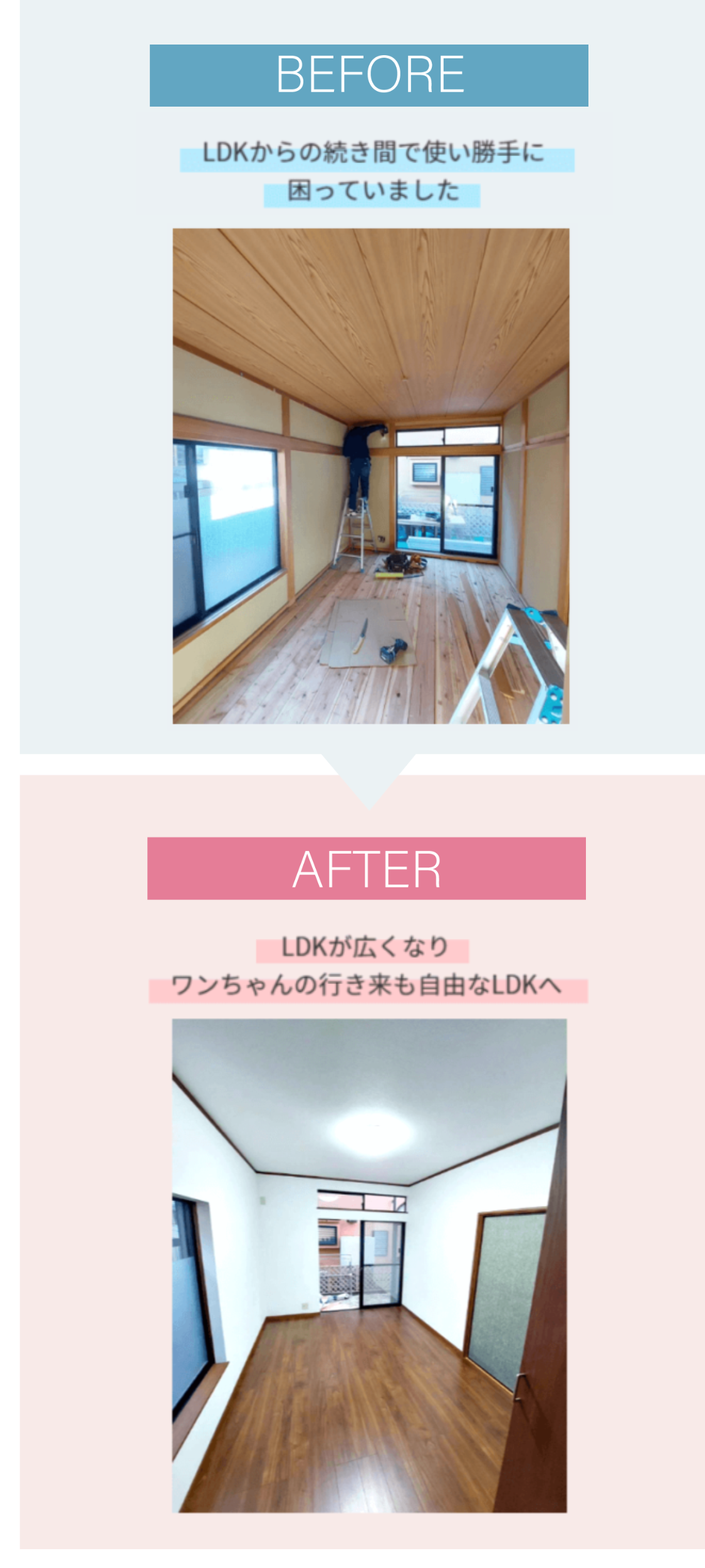 畳に傷が付くためワンちゃんは行き来が出来ませんでしたが、洋室になりそのような問題も気にせずに
