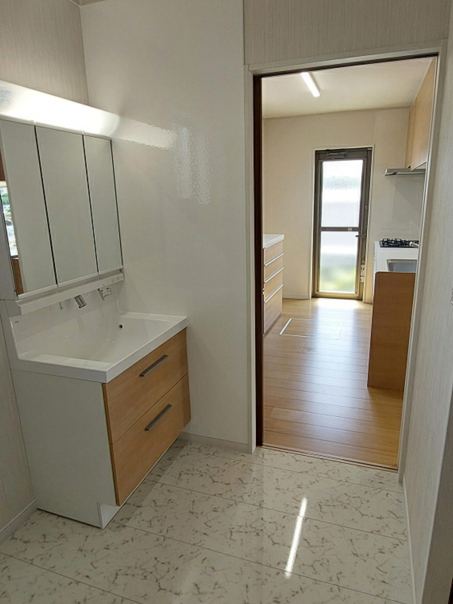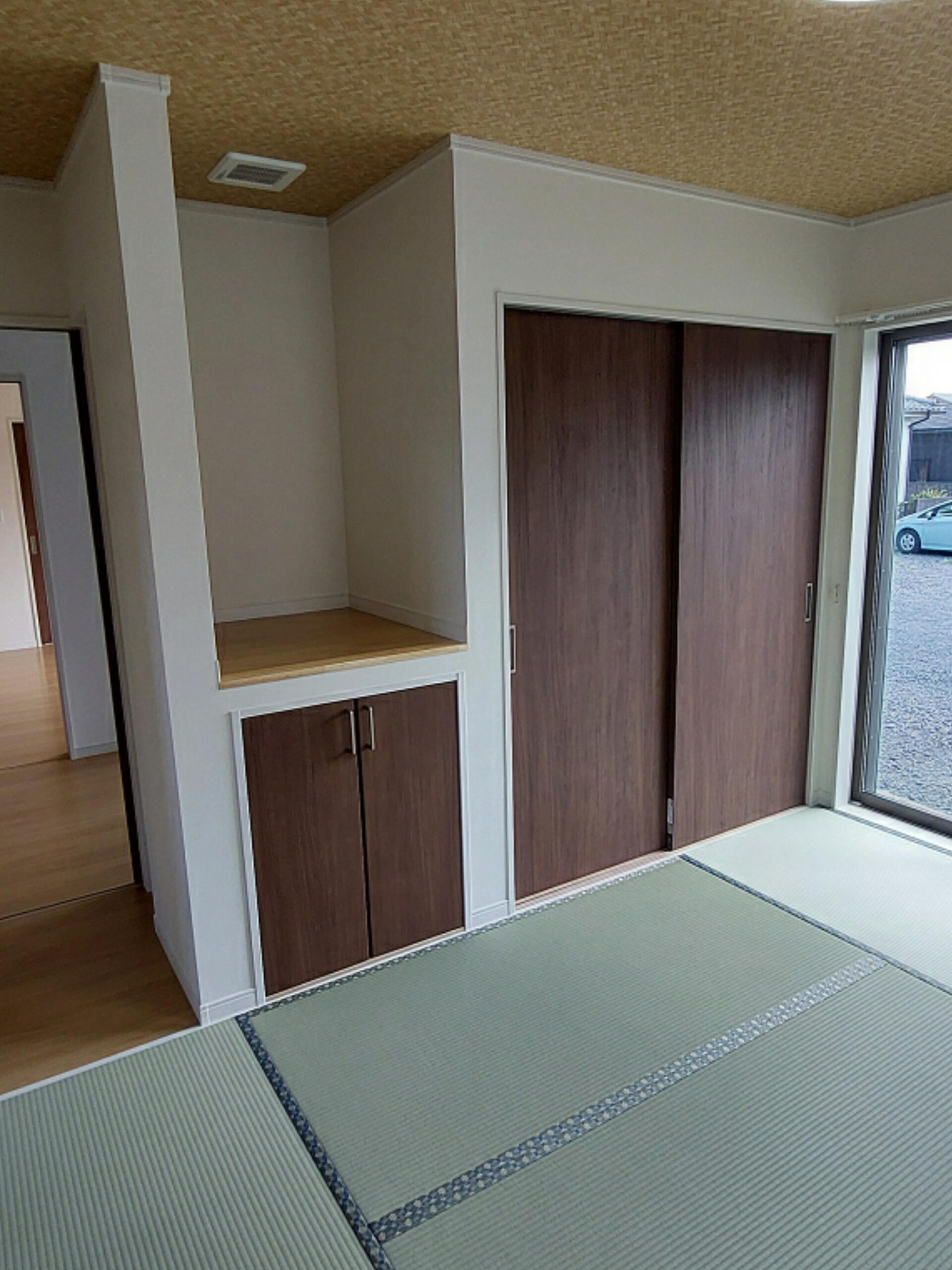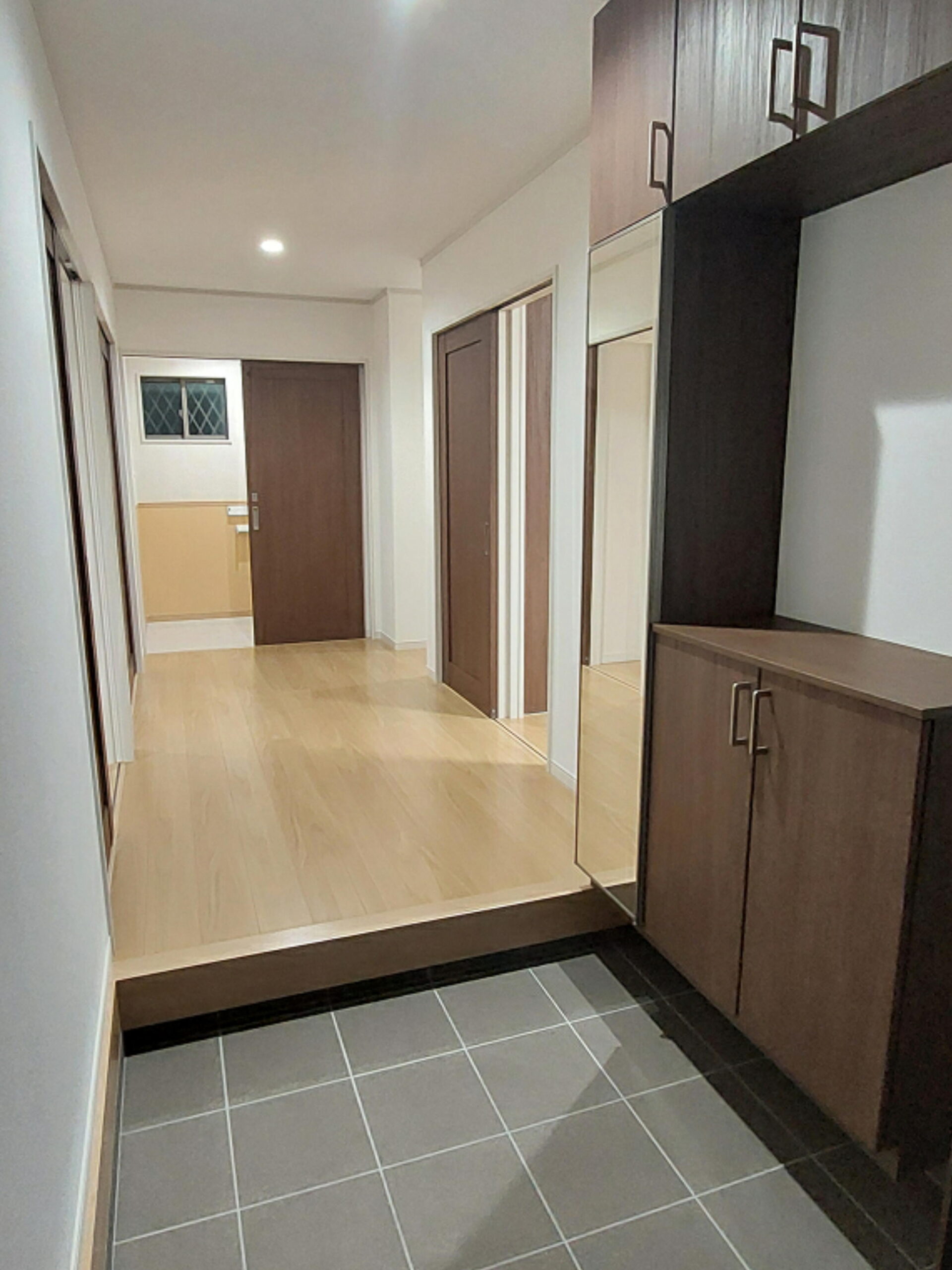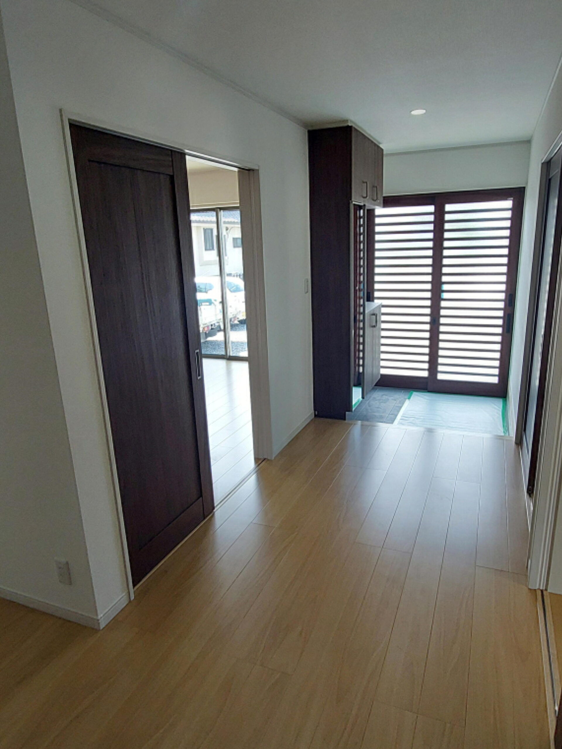 玄関ホールが広いことで空間にゆとりが生まれ、開放感ある印象に。仏壇を置く和洋室も和紙調クロス、畳にもこだわり落ち着く空間になりました。キッチンから脱衣所と廊下に行ける動線で、日当たりも考えて間取りの打合せを行いました。広々と永く過ごしやすいお家になりました。